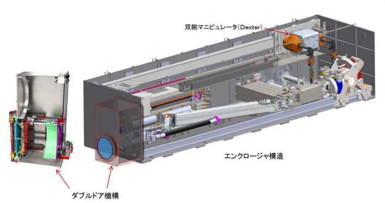 エンクロージャーはアームで一杯になっている。コンテナーに収める機構のエンクロージャーや