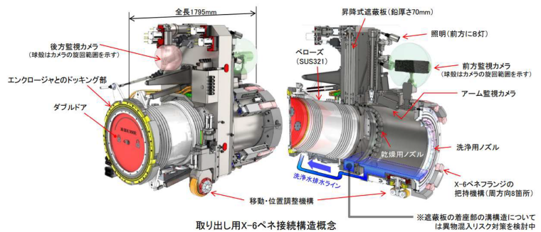 (1)燃料デブリの水冷が汚染水の源泉となっている。燃料デブリの回収が進むと冷却水の漏洩進入路をさらに削ることになり、さらに汚染水が増大すると予想される。防護区画が設定されていない。このままでは回収が行えない。