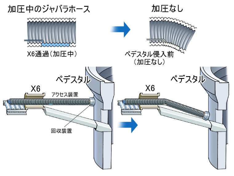 模擬設備でアクセス装置を使って回収装置を投入し、切削、圧送までの一連の動作を確認する。