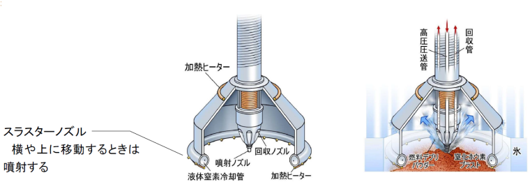 切削方法は燃料デブリに回収装置を接着し周囲を氷で閉ざし、ダイヤモンド並みの硬さと中性子吸収特性を持つ窒化ホウ素(BN)をブラストとして混ぜた高圧高温水または高圧炭酸ガスを装置スカート内から噴射し燃料デブリを粉砕するジェットミルとする。粉体となった燃料デブリを高圧ガスで圧送管を通じ保管容器まで圧送する。この間、BNが中性子を吸収し,常時臨界対策を行う。