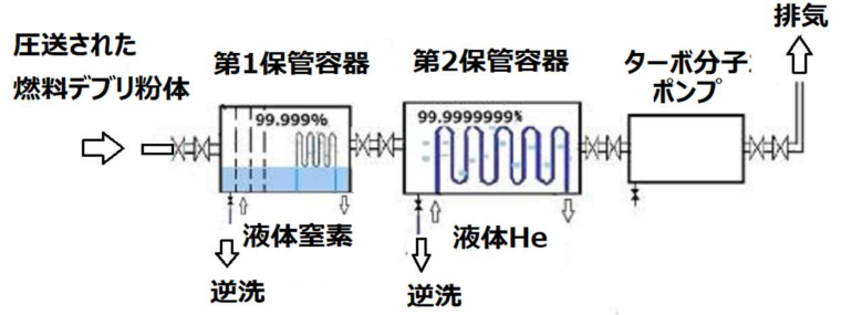 (1)高温圧縮ガスで燃料デブリのパウダーを液体窒素で冷却した第一保管容器内に圧送し、真空蒸着さ