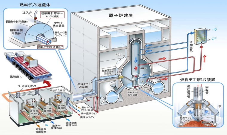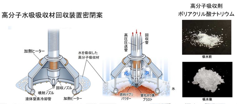 ・格納容器内は多数の亀裂があるため、漏水によって回収装置内に水を充填する事が出来ない場合、高分子吸収剤を利用し、回収装置内を固定、冷却する事で燃料デブリの回収を行う。